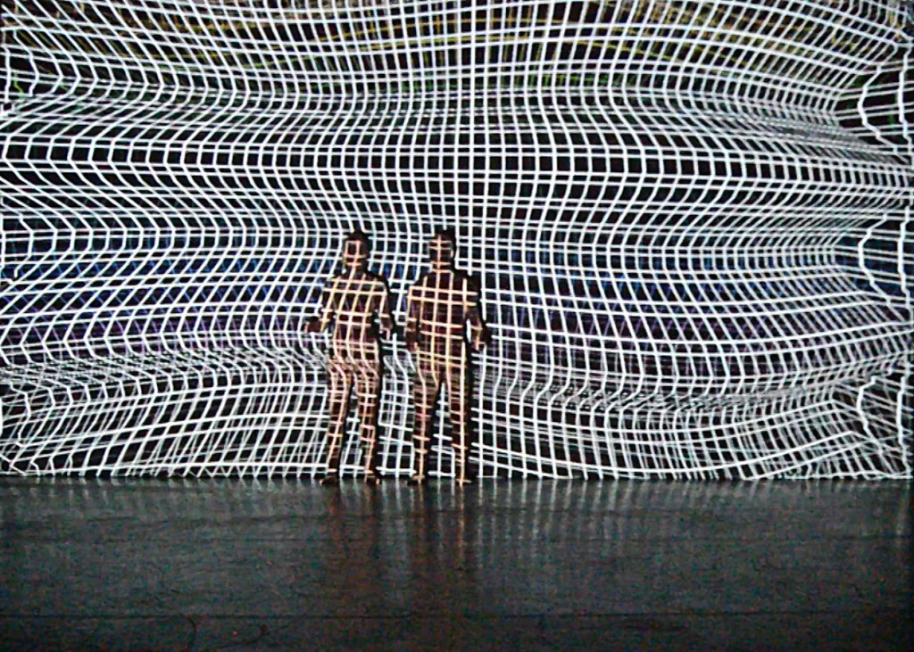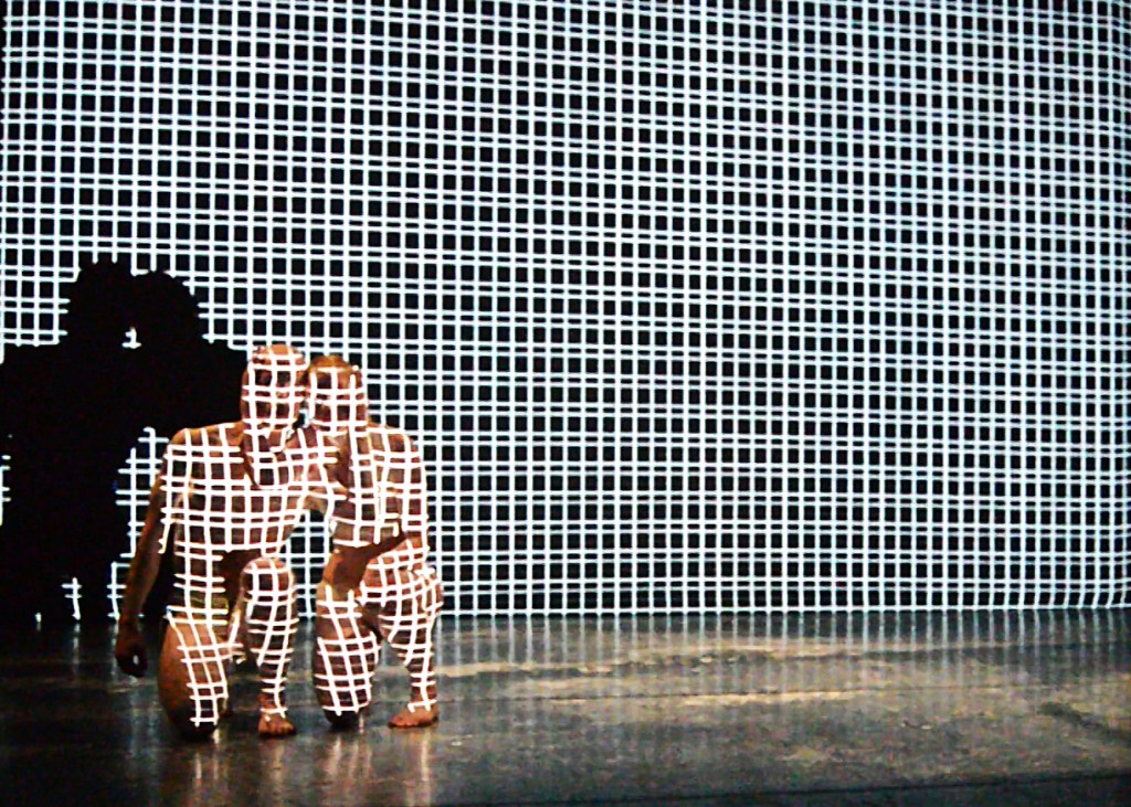 Leaning on each other, one person depends on the other. Lines and patterns are connecting together and intertwine with each other. The lines of the dancers merge into the lines of the projection. Bodies and lines flow together. This is the optimal connection.