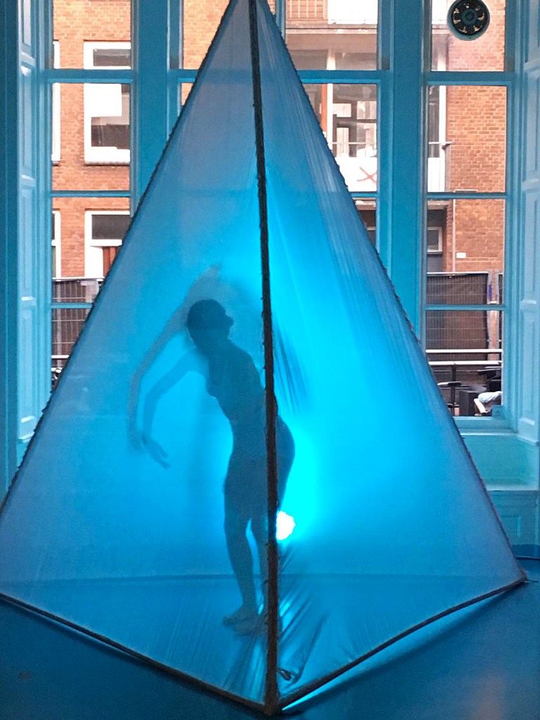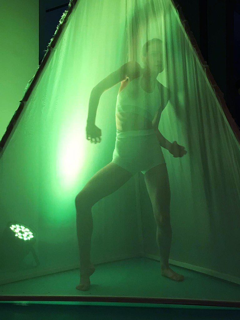 We live on our own islands, in our own cells of likes on social media and our own digital world that shows the perfect version of ourselves. The development of virtual reality makes it even easier to live in your own created world and to separate ourselves from reality. The tetrahedrons and the light design were designed and made by Hannah Goedhart for her ArtEZ graduation project. After her graduation year she continued to develop her graduation work. For this performance it has been given a deeper meaning and has been deployed in a new way.
