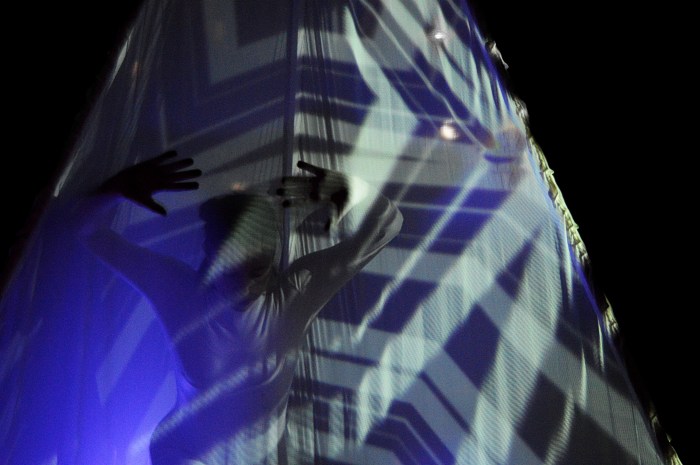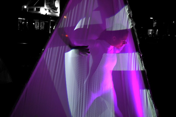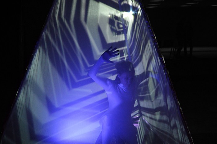 Dance, projections, lights and music became one during an interdisciplinary coöperation. The dancers are reacting on the graphic visuals and the different lines in the music. The dancers can manipulate the visuals when they touch the fabric of the tetrahedrons.