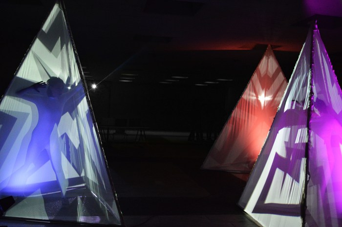 The dancer in de biggest tetraedron is following the beat, the dancer in the medium tetrahedron follows the flute and the dancer in the smallest tetrahedron is following the accents in the music. Every performance is different, because the dancers are improvising on the music and the live visuals.