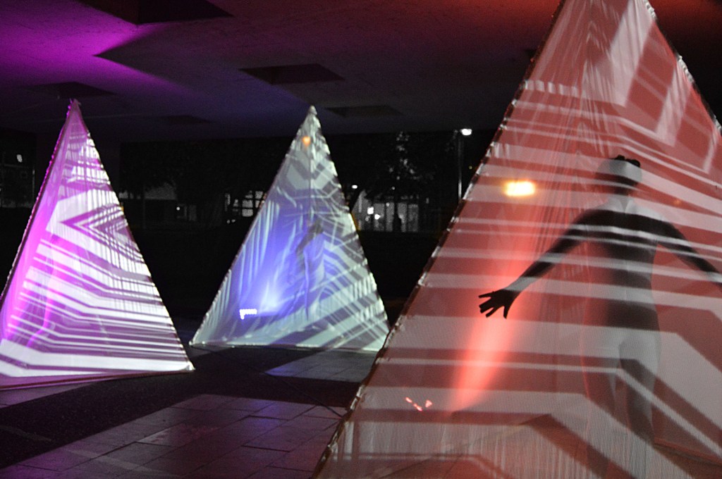 During the annual event in Nijmegen: Nijmeegse Kunstnacht, Hannah showed her graduation work under the roof of the theater of Nijmegen. For this exhibition she added coloured lights in the tetrahedrons for an extra remarkable effect. Every half an hour there were live dance performances and kaleidoscopic graphic visuals which put the audience in a trance.